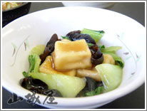 D鍋に液体だしと分量の水(または、だし汁と調味料)を入れ、高野豆腐を加え表裏反しながら煮含め、きくらげ、椎茸、青梗菜を加えて煮ます。全体に照りが付いたら出来上がりです。(お好みで、練り辛子、酢などを加えてお召し上がりください。) |